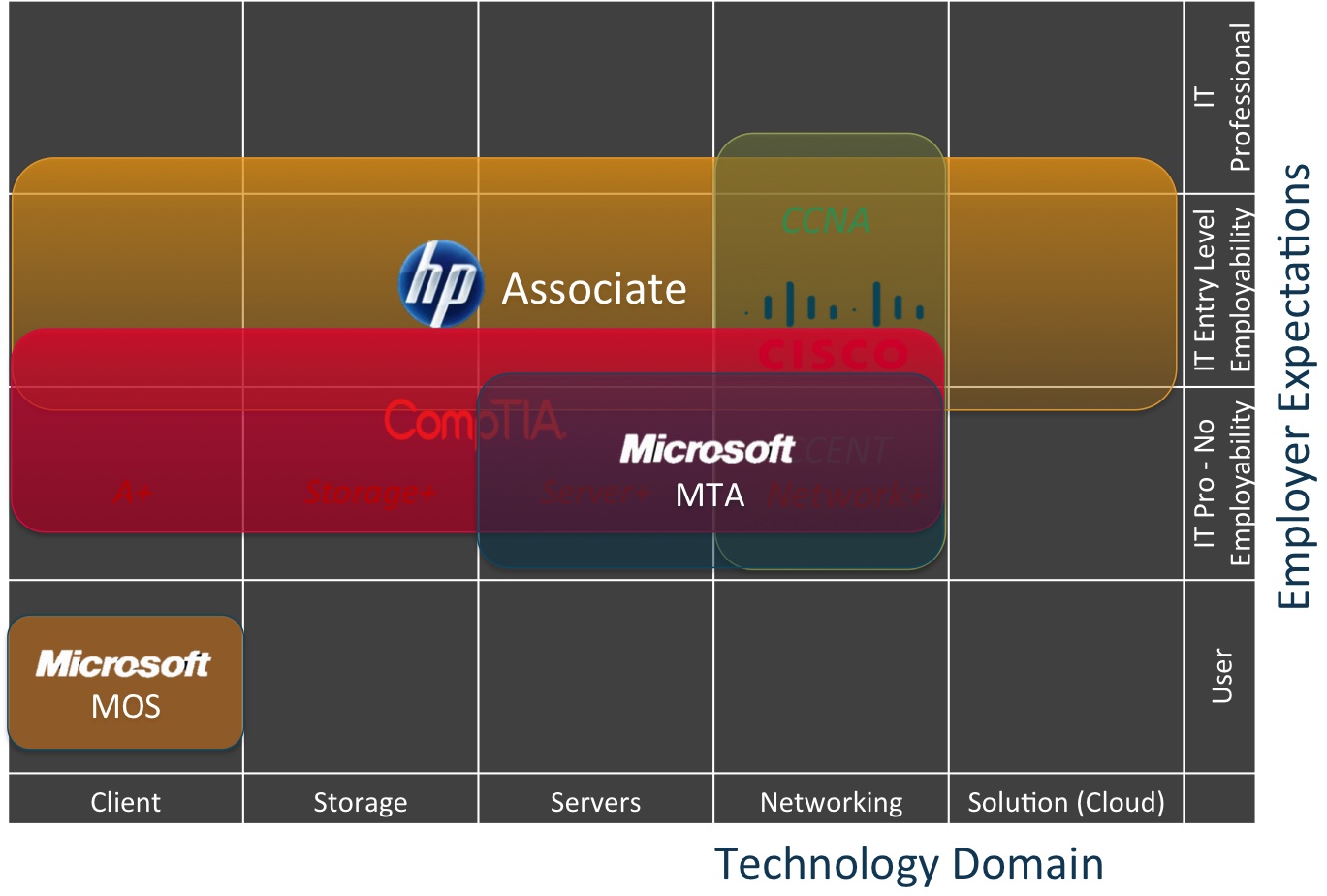 En este post os adjunto un cuadro donde se puede apreciar el posicionamiento que cada uno de los diferentes programas quiere cubrir. Espero que os sirva de utilidad si estáis pensando en iniciar una carrera formativa en cualquiera de ellos, ya que muchos de estos representan el primer paso para una formación posterior de mayor nivel. Obviamente hay muchos otros programas, este cuadro se centra en los programas HP ATA, CCNA Cisco, CompTia Strata, MTA Microsoft y MOS Microsoft.